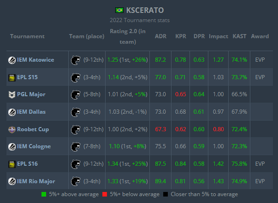 KSCERATO的排名并不高,和stavn一样,他在大赛中有所下降(1.09 Rating),但也因为他与其他选手相比缺乏样本量,并且在年中有一段时期的糟糕表现。