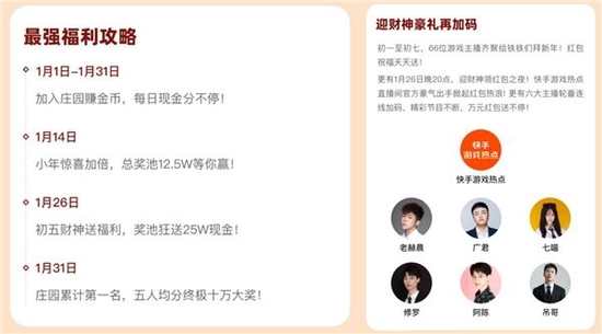 此外,初一至初七,66位游戏主播齐聚快手,给老铁们拜年,红包祝福狂送七天!更有快手游戏热点豪气出手,直播轮流连麦五大游戏主播向玩家拜年,花式奖惩精彩内容高潮迭起,同时主播将化身财神爷狂撒直播间红包雨,让玩家的新年红包更鼓一点!