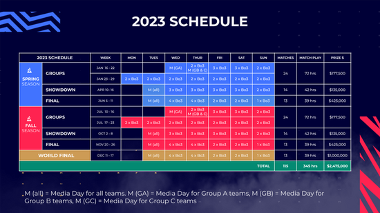 BLAST在日程表中公布了三场大型竞技场赛事(春、秋、世界决),两次线下小组赛、两次线上showdown以及各地区的线上预选赛。整个巡回赛体系包含2475000美元奖金。