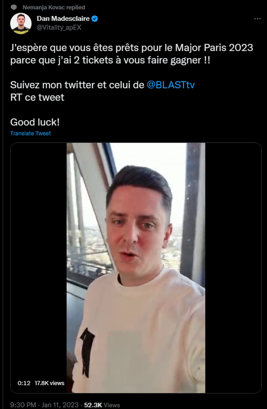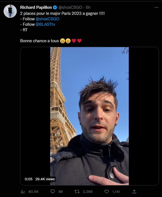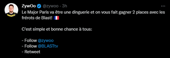 三位法国重量级选手还为粉丝们带来了福利。只要转发他们的抽奖推特,并关注他们和BLASTtv的推特账号,就有机会赢得BLAST Major的门票。每位选手将抽取两位幸运粉丝。