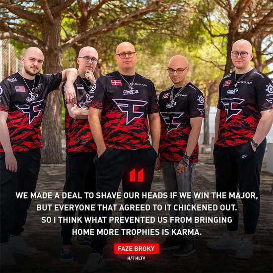 刚刚在2022年度最佳选手排名获得第6位的FaZe Clan狙击手Helwice "broky" Saukan半开玩笑的表示,在IEM2022科隆之后,FaZe Clan出现了下滑,而之所以下半年没有拿到更多的冠军,是因为选手们没有兑现赢得比赛之后剃光头的承诺。