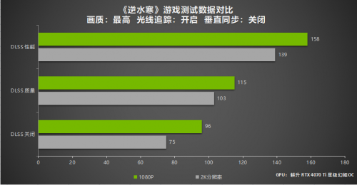 《逆水寒》是网易制作开发的一款国风武侠题材游戏,游戏支持光线追踪技术,为玩家带来全新光影体验。游戏率先采用了“路径光线追踪”技术,在特殊场景下会呈现出更加逼真的物理反射效果。同时游戏支持NVIDIA DLSS 3,开启后玩家可以获得大幅游戏帧数提升。在1080P下,开启DLSS 性能模式与关闭模式帧数提高了62帧,而在2K分辨率下帧数对比提高了64帧,可见在高分辨率下更能凸显出DLSS 3对性能提升的优势。