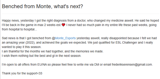 但坏消息是,我也被Monte下放了。我真的很失望,因为我觉得我们2022年的成绩很不错,实现了预期目标。我们还获得了ECL的资格,我真的很想参赛。