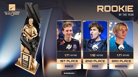 HLTV在2022年颁奖典礼上公布了最佳年度最佳新秀的获奖者,m0NESY凭借1.17的平均rating、64.3%的首杀成功率和1.22对阵顶级队伍的rating获得此荣誉。