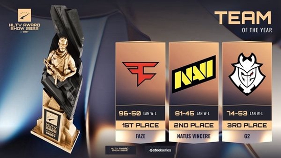 HLTV在2022年颁奖典礼上公布了年度最佳战队的获奖名单,FaZe Clan凭借全年4座冠军奖杯和96-50的线下比赛战绩获此殊荣。