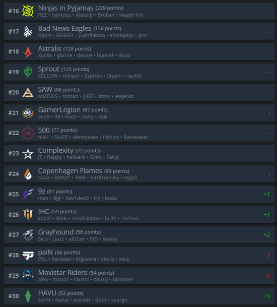 Top30中,9z、IHC和灰狗排名上升1-2位,paiN下降三位。