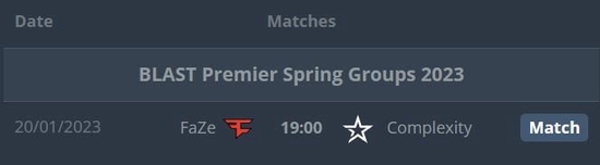 如今距离FaZe今年首场比赛还剩下不到40个小时了,他们在BLAST Premier春季小组赛中首战将会对阵Complexity战队。时间为明天晚上19:00。FaZe目前被分在了B组,同组的战队还包括Liquid、OG。