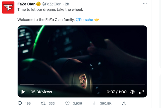 FaZe俱乐部刚刚在社交媒体上宣布已经和保时捷达成了合作。