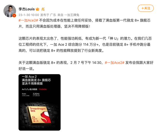 一加 Ace 2 将为用户带来同档位产品中前所未见的极致体验。性能上,一加 Ace 2搭载满血版骁龙8+移动平台,安兔兔跑分高达1149494分,刷新骁龙8+移动平台最高纪录。李杰提到“一加不会因为成本在性能上做任何妥协,Ace系列只用满血版,坚决不用降频版!”