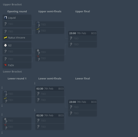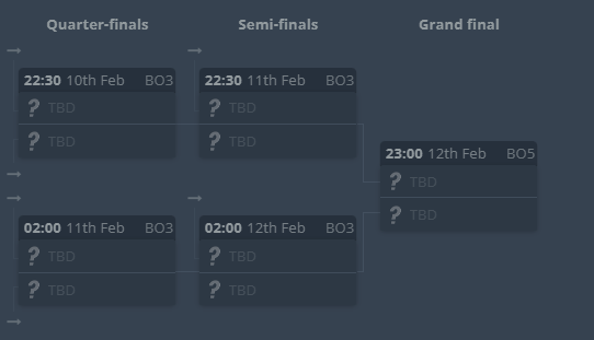 赛制:分为两个小组,每组8支队伍。每个小组皆进行BO3双败较量,小组第一进入半决赛,小组第二、第三进入四分之一决赛。