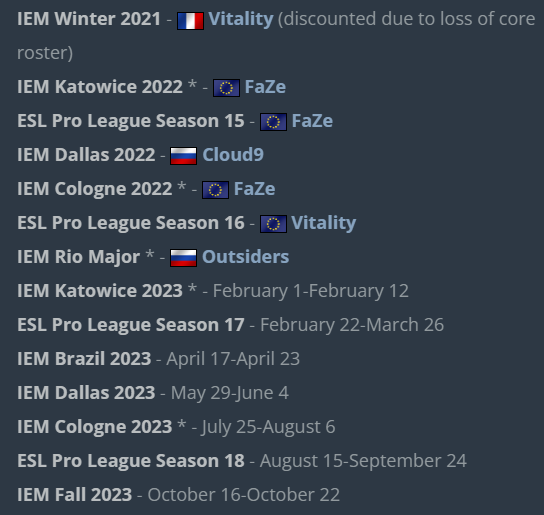 除了FaZe之外,还有3支队伍在争夺大满贯,他们每支队伍都有一个冠军,Cloud9赢下了IEM达拉斯,Vitality赢下了EPL S16,Outsiders赢下了IEM里约Major。