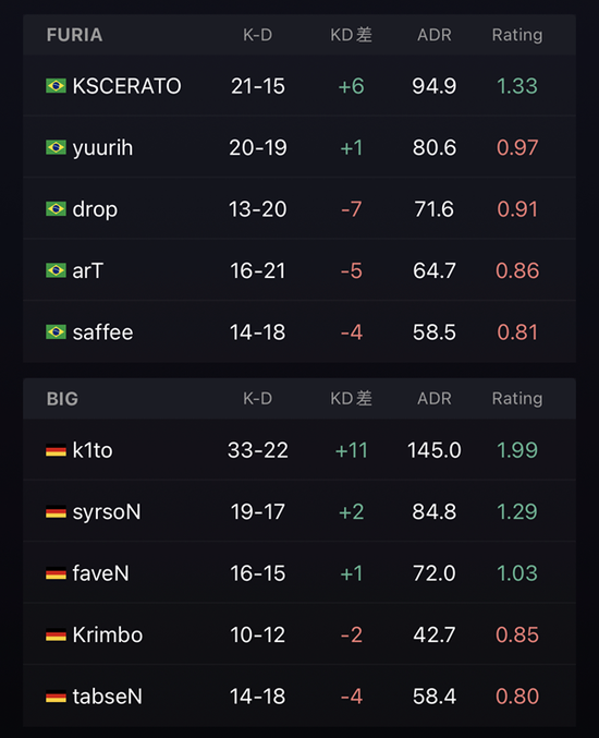 BIG在进攻端始终无法给FURIA足够的压力,FURIA铁桶一般的包点防守让他们苦不堪言。率先拿下赛点的FURIA并没有给BIG太多机会,绝对防御稳稳收下图一。恭喜FURIA 16-11 BIG!