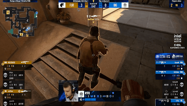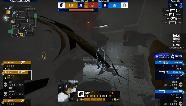 比赛来到上半场第一个长枪局,FURIA选择直接爆弹A区,但是k1to化身二楼下战神,双杀顶住了FURIA的第一波冲击。saffee虽然收下两人,但是k1to背身一刀直接终结!BIG扳回一分。