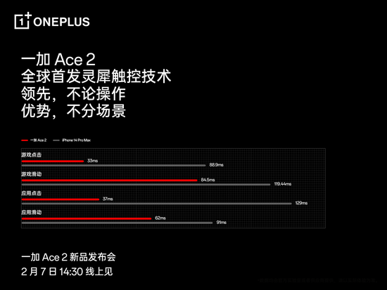 2月2日,一加手机官方公布,一加Ace 2将全球首发1.5K灵犀触控屏,支持120Hz高刷新率、高频 PWM 调光,带来流畅顺滑的视觉体验。一加 Ace 2搭载了独家自研的灵犀触控技术,实现了对手机触控系统的全链路优化,全面提升触控跟手性、精准度和稳定性,多项触控数据超越iPhone 14 Pro Max,树立“触控新标杆”。