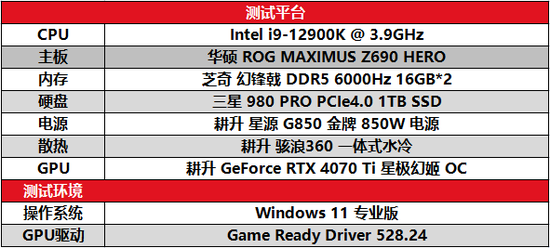 本次测试平台处理器采用Intel i9-12900K 搭配 华硕 ROG MAXIMUS Z690 HERO主板;内存采用 芝奇 幻锋戟 DDR5 6000Hz 16GB*2;电源采用的是 耕升 星源 G850金牌 850W搭配 耕升 骇浪360 一体式水冷,能最大程度为GPU降温和供电。驱动更新至最新的 NVIDIA Game Ready驱动528.24版本。这套配置足以让 耕升 GeForce RTX 4070 Ti 星极幻姬 OC 显卡能在稳定的环境下最大程度发挥出超强性能。