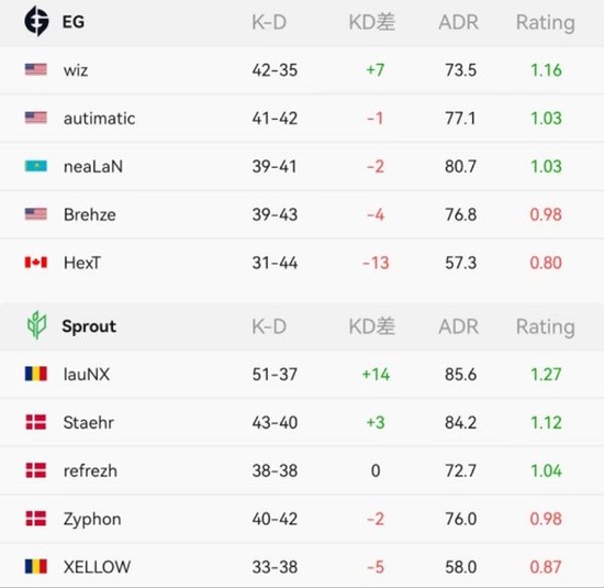 来到图二Mirage,EG在进攻上采取更多的报团,在上半场连拿9分后,10-5领先Sprout。然而易边后EG众人失去状态,反观Sprout的Staehr枪感火热,全图砍下1.31的rating助Sprout再次完成翻盘。