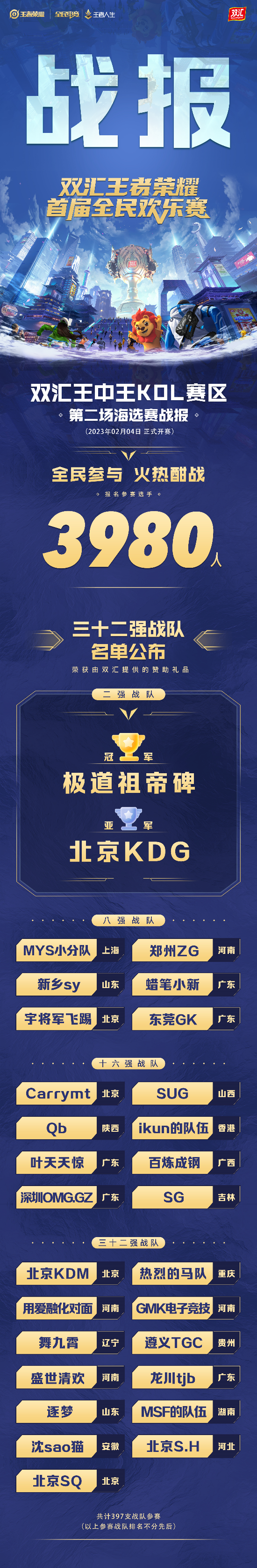 2月4日,双汇王者荣耀全民欢乐赛的第二场海选赛正式开赛,本场海选赛保持了第一场海选赛的劲猛势头,报名人数及战队数量再创新高,截至开赛当日,双汇王中王KOL B赛区吸引了3978人次报名参赛,共组成397支强势战队,各路英雄好汉云集,交锋峡谷之巅。