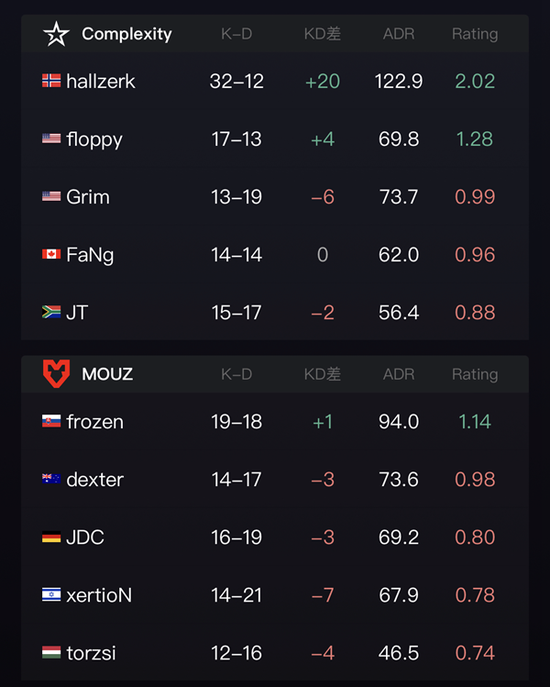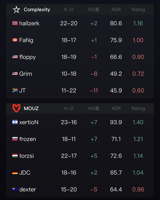 MOUZ始终无法突破Complexity的防守,多次的进攻受挫让他们丢掉了大量的分数。拿下赛点的Complexity没有给MOUZ挣扎的机会,迅速以16-9结束了比赛。