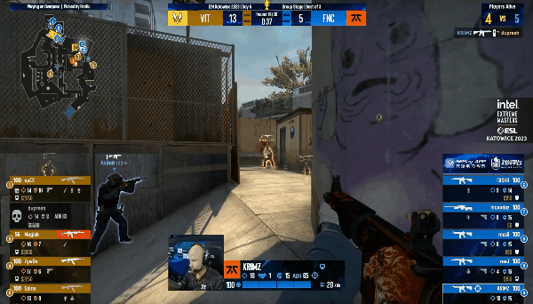 比赛来到上半场第一个长枪局,开局Vitality常规默认,控制住了匪厅并向铁板推进,大光头持续补烟拖住Vitality的进攻节奏,没有足闪光二点Vitality只能干摸铁板。以色列狠人终于站了出来拿下双杀,帮助队伍控制B包点。剩下的fnatic三人只能选择保枪。