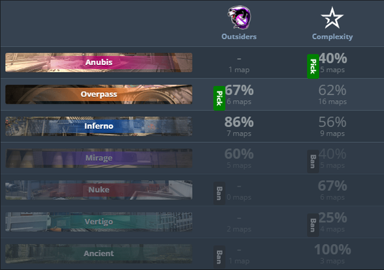 Outsiders 2-1 Complexity(Anubis 19-15;Overpass 13-16;Inferno 16-13)
