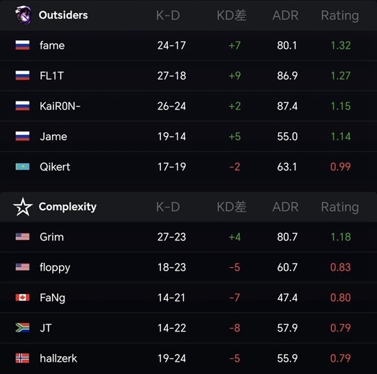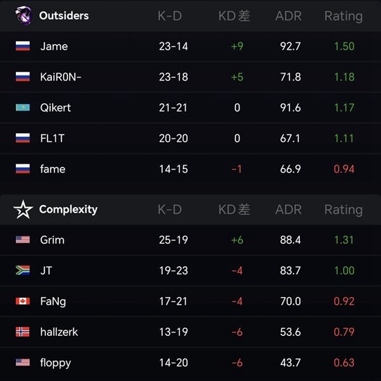 来到下半场,Outsiders赢下手枪局和刚枪局追平了比分。但是Complexity不愿意就这样被对手拉开比分,双方再次回到了你来我往的节奏。胶着之时,Outsiders队伍中最年轻的选手KaiR0N站了出来,他的多杀以及优秀的主A防守为Outsiders重新带来比分领先,稳住局势的Outsiders回到了自己熟悉的节奏。局势越紧张,他们越冷静,最终凭借着Jame的首杀和更合理的防守选位,Outsiders击败对手晋级淘汰赛。