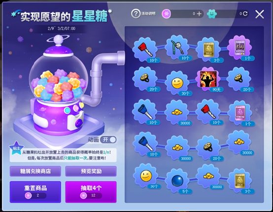 2月9日服务器维护后~3月2日7点,玩家可使用少量星星糖币进行商品重置,直到出现心仪的商品为止。抽取商品后可以免费重置商品。祝您获得心仪的商品!