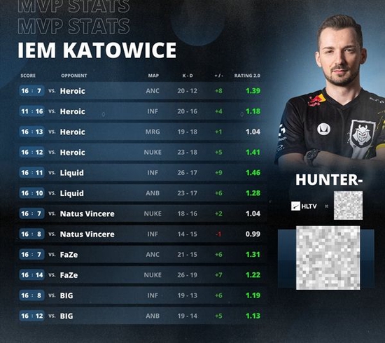 随着G2在决赛中3-1击败Heroic,IEM卡托维兹2023圆满落幕。赛后HLTV也公布了本届赛事的MVP选手,凭借着稳定的发挥和决赛中的精彩表现huNter-获得了自己职业生涯中第二枚MVP奖章。