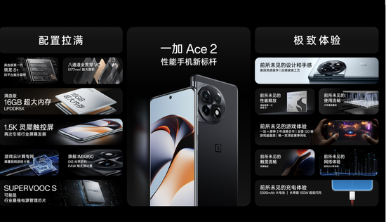 一加 Ace 2还搭载了多项独家自研“黑科技”,为用户带来同价位段前所未见的极致体验。一加 Ace 2全球首发搭载SUPERVOOC S全链路电源管理芯片,搭配长寿版100W超级闪充系统以及5000mAh大电池,25 分钟即可从 1%充到 100%,为用户带来了全新充放电体验;一加Ace 2全球首发1.5K灵犀触控屏,搭载了独家自研的灵犀触控技术,实现了对手机触控系统的全链路优化,全面提升触控跟手性、精准度和稳定性,树立“触控新标杆”;一加 Ace 2采用旗舰同款 IMX890 主摄和自研 RAW 域无损计算技术,打破性能手机影像功能弱的固有印象,让用户真正享受到旗舰级体验。