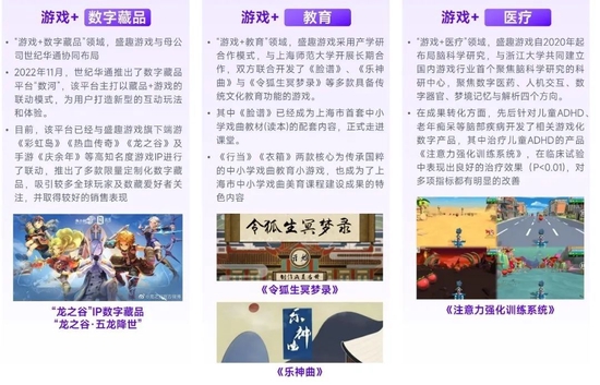 盛趣游戏的发展潜力主要表现在“游戏+”及境外市场。“游戏+”依托跨界应用有着较广的发展空间,例如助推更多产业的健康发展,又如拓宽数字化应用的场景边界。盛趣游戏旗下运营着众多高知名度游戏,且拥有广泛的玩家群体,未来有望为企业从至少两方面带来发展机会:一方面,通过数字藏品跨界开展各类数字营销,扩展和覆盖更多领域用户,如《庆余年》手游与文化IP“觅境红楼梦”合作,为用户带来新型的互动玩法和体验;另一方面,可帮助企业拓展新的业务方向,例如“游戏+教育”与“游戏+医疗”,能够在提升企业社会价值的同时进而实现企业成果产出的多元利用价值。