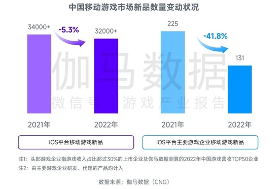 新品难以有力支撑市场的现象在2022年较明显,同时产品创新难度大、头部产品固化的特征让新品更难突围。产品创新难度大持续影响产业的精品化进程,现阶段创新产品的研发思路也有所变化,产品一方面需要汲取多款产品研发经验进而确保产品玩法的成熟性与商业化成功率,但又要保证产品在玩法层面具备自身的特色,这一平衡点难以把控;头部产品固化的特征主要体现在提供主要收入的产品仍为上线多年的老产品,占据了大量用户,但又难以为市场规模提供有效增量,且部分产品逐步进入生命周期衰退期。头部新品固化也主要受新品产出数量下滑影响,其中头部企业的新品产出数量更是在2022年减少超4成,远高于产业平均水平,而头部企业的新品对市场的影响作用更大。