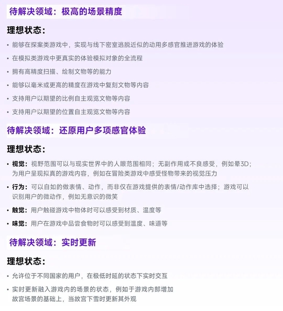 “强化用户的拟真体验”将使用户在线上的参与体验无限趋近甚至超越线下,以旅游为例,相较于传统旅游方式,在元宇宙游戏中旅游或可实现在保持与线下旅游一致的听觉、触觉、嗅觉等的感受的基础上,具备随时随地、降低与同伴协调时间的难度、无需错峰出行等利好。但这部分期望的落地对技术水平提出极高要求,例如以毫米级精度还原游戏场景及用户、为用户提供多感觉的拟真体验、能够支撑海量级的数据实时传输及运算的底层能力。现阶段,以腾讯游戏、网易游戏、米哈游、元境、Unity为代表的强技术型企业是这一方向的主要布局者。