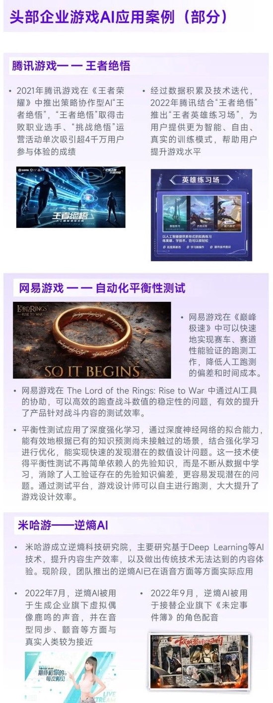 游戏AI与游戏引擎是方向不同但目的近似的科技领域游戏应用,二者相较,虽然游戏引擎更侧重于塑造游戏“形象”,而游戏AI则倾向于游戏“内涵”的升华,但二者在游戏领域的应用目的,均为实现用户对于精品化的期望。游戏AI的发展潜力主要在于普遍提升用户在游戏的过程中通过智力的博弈、情感的共鸣、沉浸的体验等获得的游戏感受。这是由于现阶段上述体验的塑造高度依赖于游戏从业者的经验与能力,使得出于人才稀缺性、试错成本等因素,难以规模化的提升产品表现。虽然发展尚不完善,但现阶段游戏AI已经可以通过学习、模拟真实人类的行为,在游戏研发、运营等阶段,以数值调试、智能NPC、提升游戏安全等级等形式,在游戏产业的重要环节投入应用。