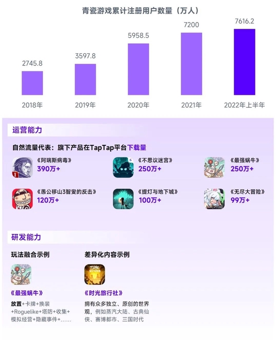 青瓷游戏的发展潜力主要体现在其研运一体能力上。在研发环节,青瓷游戏在玩法融合、差异化内容、数值体系方面拥有较强的把控能力,例如《最强蜗牛》《时光旅行社》等自研产品表现出业内少有的美术风格、世界观,以及诙谐幽默的文字风格,进而以内容创新打造差异化产品特色;在运营能力上,青瓷游戏能够根据游戏玩法特点、渠道特征及玩家自身兴趣等要素定制化每款游戏的运营活动内容,以精细化运营的方式获取了更多自然流量用户,部分用户又沉淀成为了企业粉丝,进而帮助更多产品提升获客能力,例如《使魔计划》在较少买量的情况下市场表现仍较优。