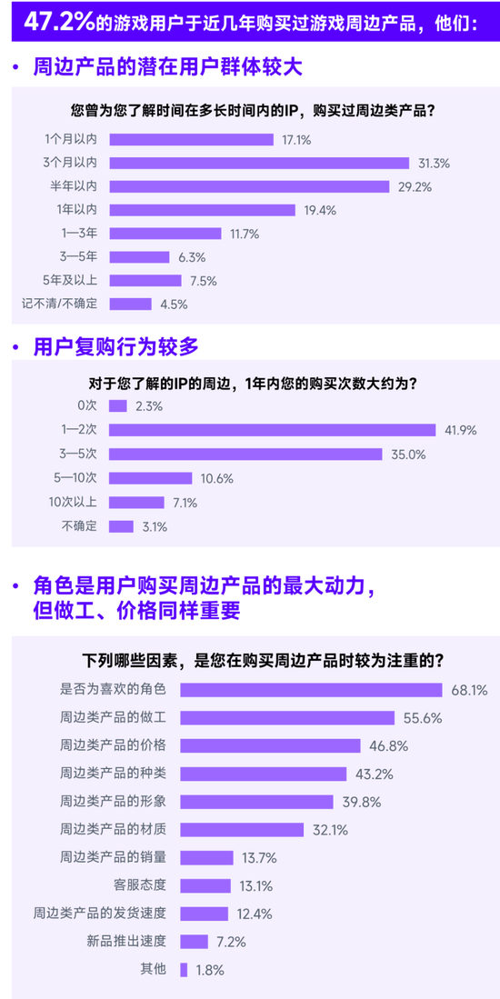 产业链拓展:47.2%的用户近年购买过周边产品,其中超50%用户每年购买3次以上