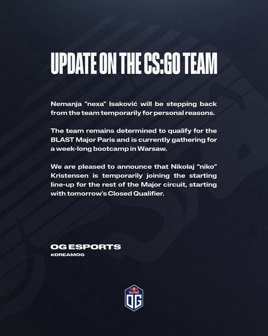 OG俱乐部在刚刚宣布,队伍指挥nexa因个人原因暂离阵容,将错过即将到来的BLAST.tv 巴黎Major 欧洲区RMR封闭预选赛。