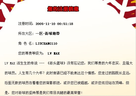 还记得2005年11月10日凌晨0点51分18秒,那时的我正就读于一所寄宿制高中,那天是星期四,那夜的我没有选择入睡,厌倦了枯燥无味的课堂,带着晚自习的疲倦,我来到网吧包夜玩游戏,那时候花上5块钱可以玩一晚上。偶然间发现一个网站上出现了街头篮球网络游戏的宣传画面,由于本人是NBA忠实的篮球迷(火箭队),所以在观看完比赛之后一直渴望有一款篮球游戏能够让我得到在现实中无法得到的成就感。我本能的点开了那个街头篮球宣传页面。领取了一个内测号,账号开头是fsi。后来便于街头篮球结下了长达17年的不解之缘。由于当时很多网吧都没有安装街头篮球,所以我只能静静的等待。。