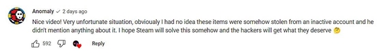 事实上Aleksandr并非唯一的诈骗犯,他们这一行也有竞争。他和V社的“鼹鼠”合作差不多一年的时间,直至分道扬镳。在视频结尾,Mzk总结道:“如果你发现一款昂贵的皮肤在一年前完成交易,而这款皮肤的所有人账号已经被删除。那么有95%的概率,这款皮肤属于赃物。”