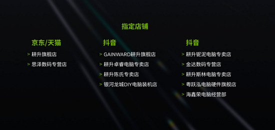 指定抖音店铺:GAINWARD耕升旗舰店、耕升卓睿电脑专卖店、耕升泥电脑专卖店、金达数码专营店、耕升陈氏专卖店、耕升斯林电脑专卖店、银河龙城DIY电脑装机店、粤跃泓电脑硬件旗舰店、海鑫荣电脑经营部