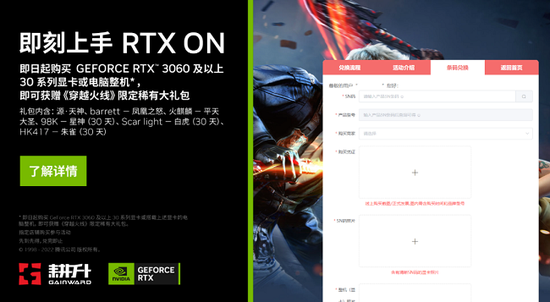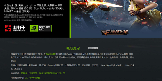 2022年12月9日至2023年02月28日,在指定店铺购买耕升GeForce RTX 3060及以上的RTX30系列显卡或搭载 耕升 GeForce RTX 3060 及以上RTX 30系列显卡的电脑整机,确认收货,且七天内并未产生退货,即可获赠穿越火线限定稀有大礼包,数量有限,先到先得,兑完即止;