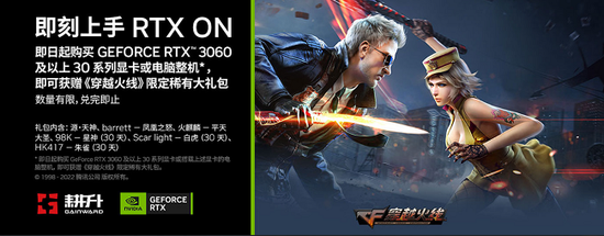 即日起购买GeForce RTX 3060及以上30系列显卡或电脑整机,即可获赠《穿越火线》“源·天神、Barrett-凤凰之怒、火麒麟-平天大圣”等道具大礼包。数量有限,兑完即止。