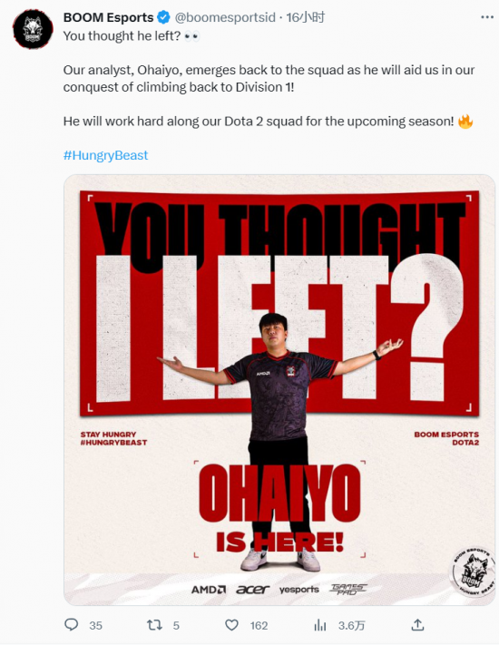 BOOM Esports战队于官方社交媒体宣布老将Ohaiyo回归战队,并担任副教练兼任战队分析师。