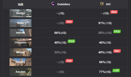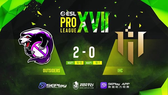 EPL S17 A组首轮小组赛,本场比赛由IHC对阵Outsiders,在IHC自己的选图Inferno中,他们在大比分落后的情况下几乎追平比分,但Outsiders在图一接近尾声时突然发力一波拿下图一的胜利。图二Overpass是Outsiders的选图,他们在进攻方就拿到了9分,转到防守方他们只失去一回合手枪局就拿下了比赛的胜利。