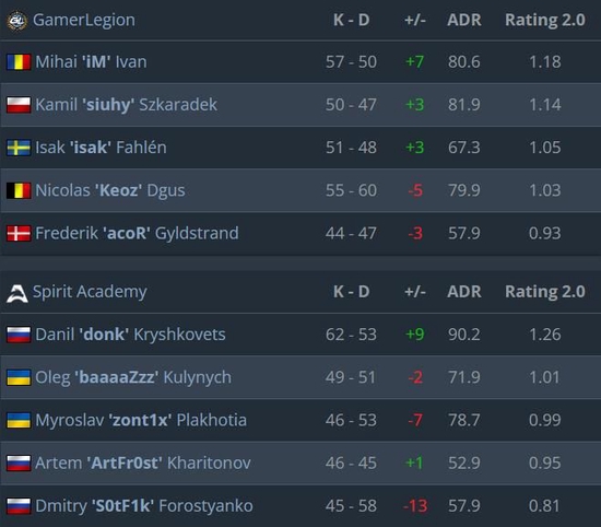 第一张地图Inferno是GamerLegion一边倒的屠杀,在自己的选择的地图上GL半场作为进攻方拿下了13分,Inferno的结局也毫无悬念。图二Nuke上GL看起来势头也非常不错,他们作为CT取得9-1的大比分领先。但随着Spirit青训队开始不断拿分,最终图二比分定格在13-16,比赛拖入图三。