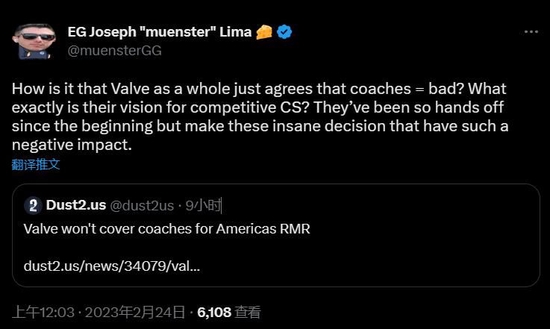 EG White战队教练Muenster也同样难掩自己的愤懑与不解:为什么V社上下都认定教练就是坏蛋?他们究竟怎么看待竞技CS的?他们一开始袖手旁观,现在却做出如此疯狂的决定,产生这么多负面影响。