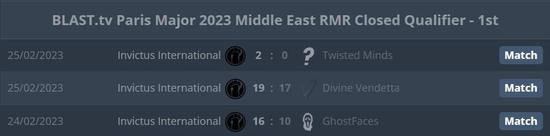 参加BLAST巴黎Major亚洲RMR中东封闭预选赛的Invictus International,成为该赛区首支晋级亚洲RMR的队伍。