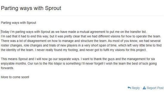 “今天我们双方达成一致,我同Sprout和平分手,俱乐部把我的名字放上了转会名单。我很伤心走到了这一步,但很明显在战队的运行方面我们有分歧。在如何组织和构建战队方面我们有很多不一致的地方。而且如你们所了解,Sprout在短时间内经历了多次变阵、阵容分工和新队员试训,因此我们几乎没时间来认清自己。我感觉自己从未找到立足点,也从未实现自己的目标。”