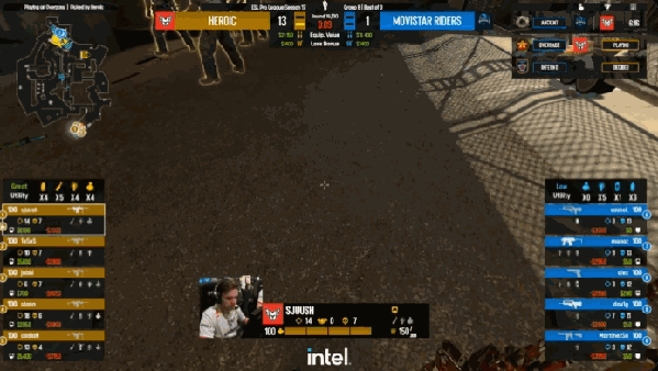 在Overpass的第14回合上,Heroic队员sjuush和TeSeS都购买了P90,开始无脑RUSH B,MRS的队员毫无还手之力,B区瞬间沦陷。