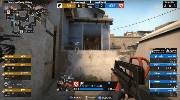 然而好景不长,FURIA想故技重施被MOUZ死死拿捏。第11回合凭借drop在拱门的快速双杀艰难取得第二分。上半场最后几局中,KSCERATO贡献了一把精彩的1V2沙鹰残局,除此之外再无亮眼操作。上半场比分11-4。