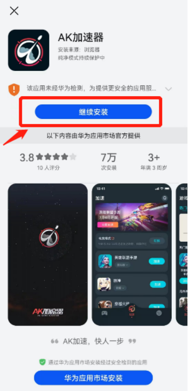 第二步:下载成功后点击【继续安装】,注意不要点击【去应用市场安装】。