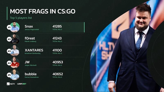根据HLTV的统计,前Virtus.pro选手Janusz Pogorzelski|Snax在CSGO上的总击杀数已经超过Patrik Lindberg|f0rest,来到历史第一位!